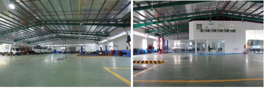Xưởng dịch vụ được đầu tư với diện tích gần 3.000 m2 sạch sẽ, thoáng mát nằm trên Quốc lộ 13 không ảnh hưởng tới việc cấm xe. Trang thiết bị sửa chữa được trang bị hiện đại với đội ngũ công nhân kỹ thuật có tay nghề cao chuyên thực hiện bảo trì, bảo dưỡng và sửa chữa từ đơn giản đến phức tạp nhất. Đặc biệt với những khách hàng ký hợp đồng bảo dưỡng sửa chữa chúng tôi có những chính sách ưu đãi đặc biệt như : kéo xe miễn phí trong bán kính 10km, cơm trưa miễn phí cho tài xế tại căn tin công ty … Quý khách trong khi chờ xe sửa chữa sẽ được thư giãn tại Phòng nghỉ máy lạnh xem truyền hình cáp với ghế ngồi và ghế nệm nằm thoải mái.